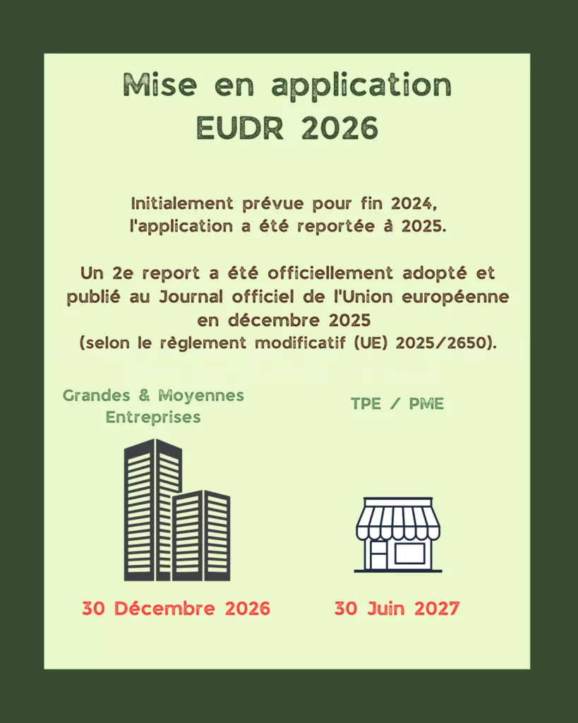Initialement prévue pour fin 2024, l’application a été reportée et devait s’appliquer fin 2025 pour les grandes entreprises et en juin 2026 pour les PME. Un deuxième report a été adopté depuis.